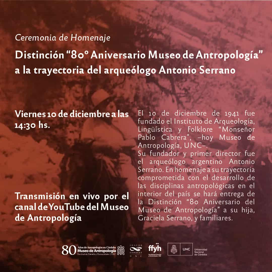 La Comisión Ejecutiva conformada por el 80º Aniversario del Museo de Antropología propuso dar cuenta del reconocimiento a la trayectoria de Antonio Serrano, otorgándole en su nombre una distinción a su hija Graciela Serrano y familia. De esta manera, la distinción al «80º Aniversario Museo de Antropología» será el viernes 10 de diciembre, a las 14.30 hs, por el Canal de YouTube del Museo de Antropología, por sus aportes en la constitución de esta institución, dentro de su proyecto de investigación y el desarrollo de las disciplinas antropológicas en el centro del país.