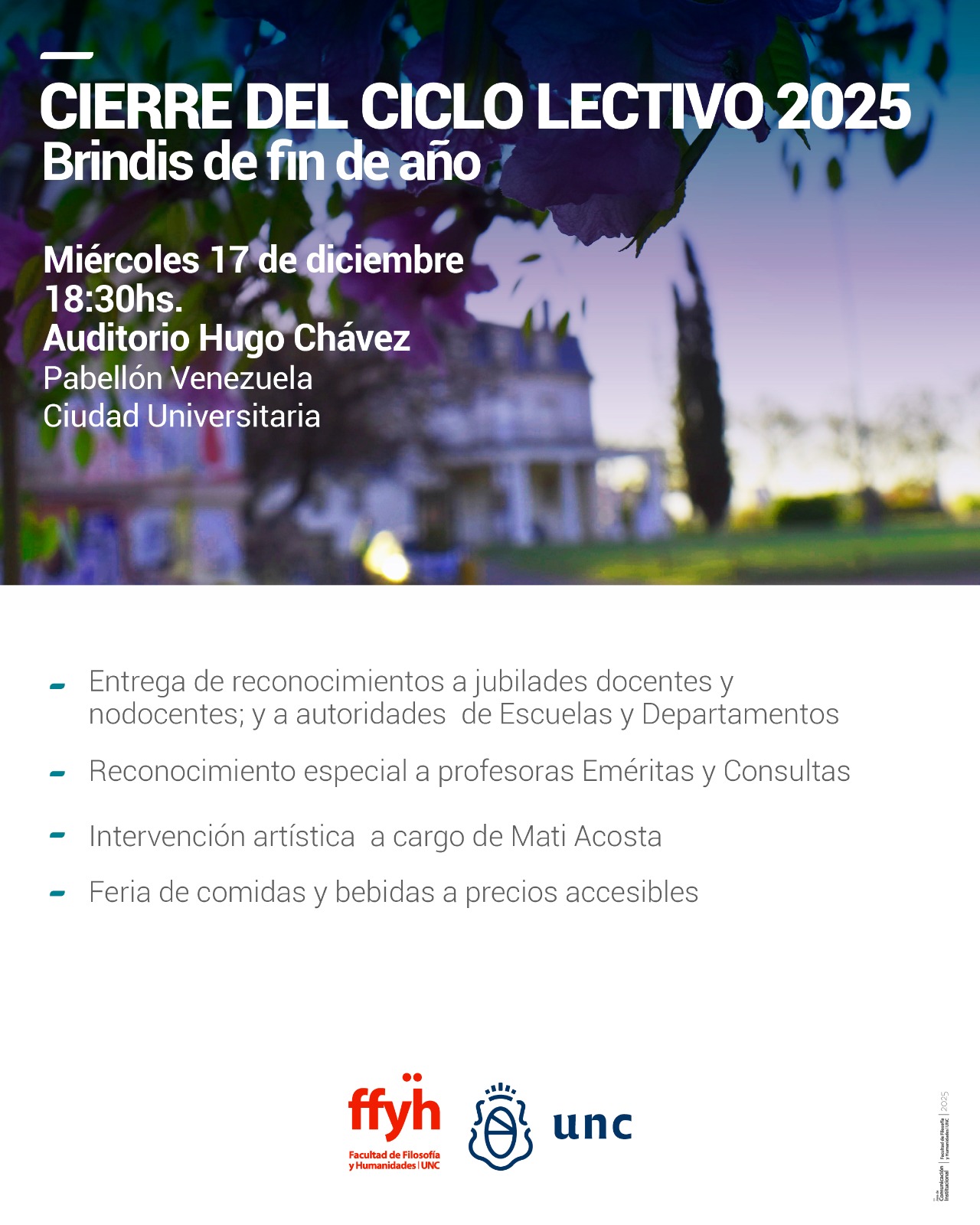 En la ceremonia se llevará a cabo también la entrega de reconocimientos a jubildades docentes y nodocentes, y a las autoridades de Escuelas y Departamentos que culminaron su período en 2025 y las que asumieron el 1º de diciembre.
