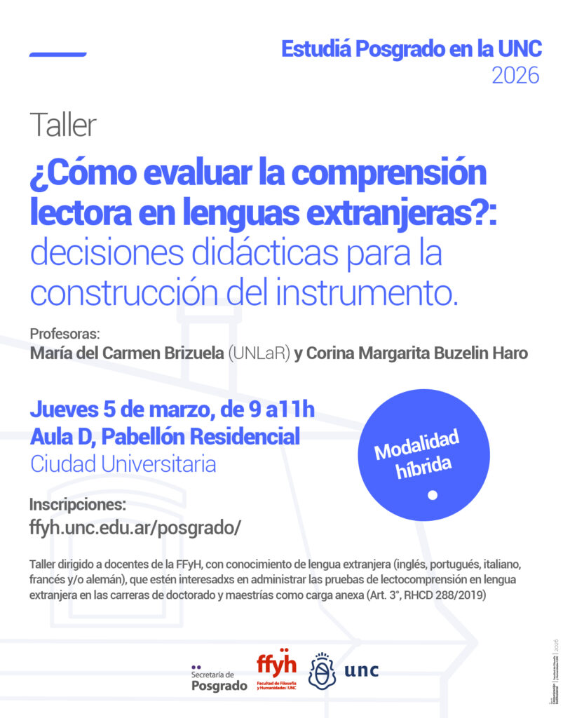 Taller dirigido a docentes de la FFyH, con conocimiento de lengua extranjera (inglés, portugués, italiano, francés y/o alemán), que estén interesadxs en administrar las pruebas de lectocomprensión en lengua extranjera en las carreras de doctorado y maestrías como carga anexa (Art. 3°, RHCD 288/2019)