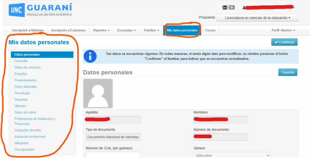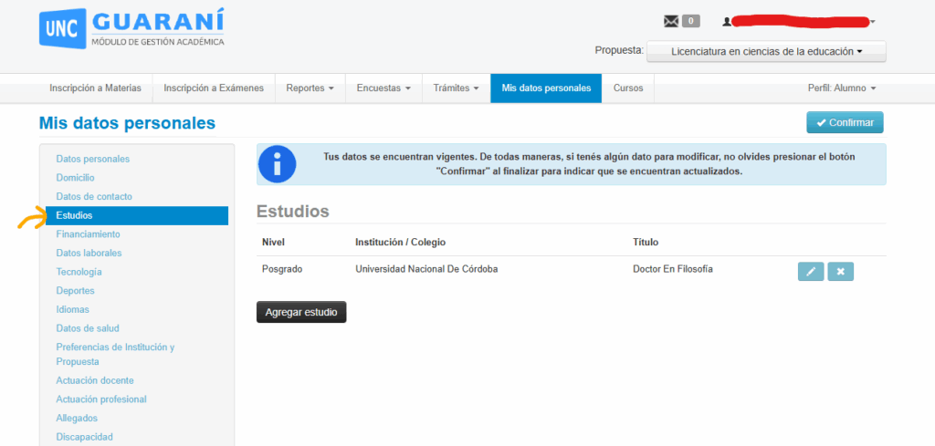 - En datos personales se deberá completar obligatoriamente el campo «estudios» indicando el título de grado con el que se ingresó a Posgrado (Por ej: Licenciado en Ciencias de la Educación – Universidad Nacional de Córdoba)