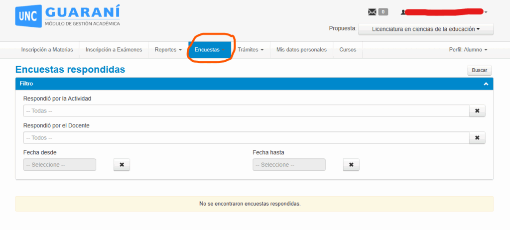 - Responder la Encuesta de Recién Graduado (Kolla) en TRÁMITES / ENCUESTAS / ENCUESTAS PENDIENTES. Guardar o confirmar los datos.