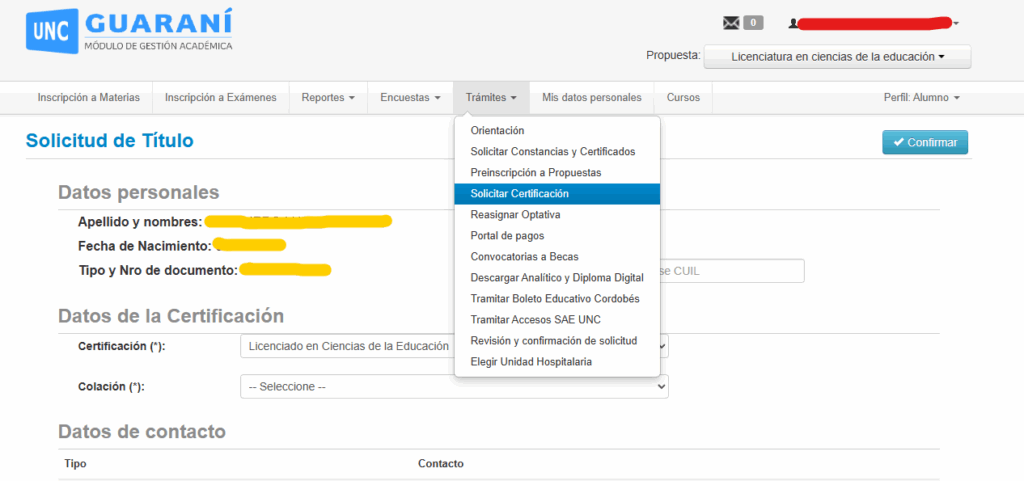 - Inscripción a Colación (TRÁMITES / SOLICITAR CERTIFICACIÓN / NUEVA SOLICITUD) Allí completar los datos solicitados correspondientes a P12-2026-01 (se refiere a la primera colación de 2026). Completar y guardar o confirmar datos.