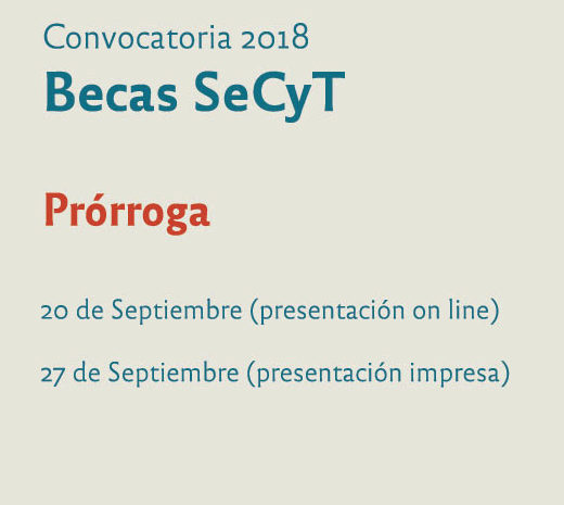 La Secretaría de Ciencia y Tecnología (SeCyT) informa que, debido a las consecuencias administrativas derivadas de los paros docentes y tomas de numerosas dependencias de la UNC, se resolvió prorrogar el cierre de la convocatoria 2018 a becas de la SeCyT.