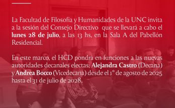 La Facultad de Filosofía y Humanidades de la UNC invita a la sesión del Consejo Directivo que se llevará a cabo el lunes 28 de julio, a las 13 hs, …